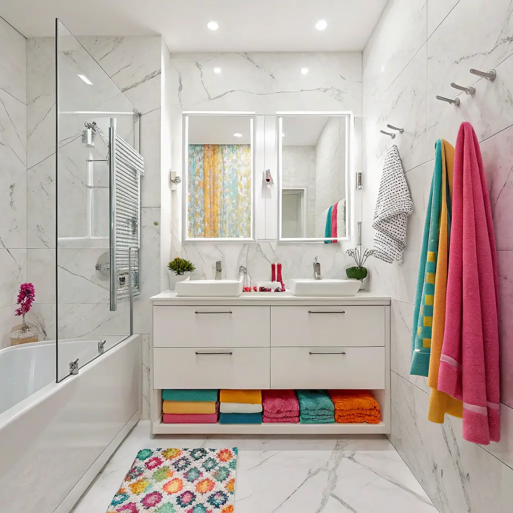 Seasonal color changes become effortless with white marble. I swap towels and accessories quarterly, completely changing the bathroom’s vibe without touching the timeless marble tiles. Summer gets bright coral, fall brings deep burgundy, winter adds forest green, and spring blooms with blush pink.