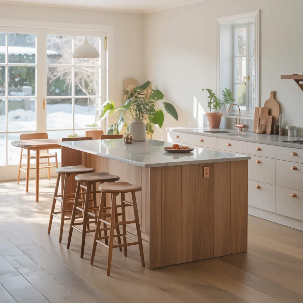 What sets Scandinavian white oak kitchens apart? They embrace the wood’s natural blonde tones rather than staining it darker. Pair this with white walls, black accents, and maybe a sheepskin throw over a bar stool, and you’ve nailed the aesthetic.