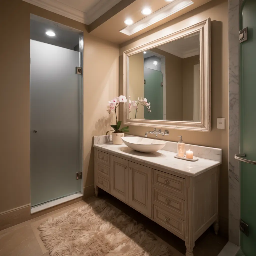 My favorite trick? A narrow white oak console vanity with a vessel sink. Takes up minimal space but looks like a deliberate design choice, not a compromise.