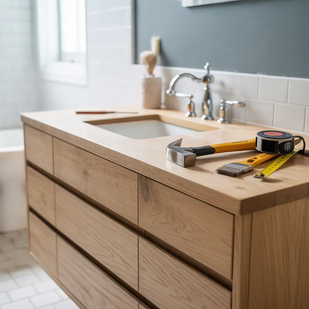 Start with a basic cabinet box (IKEA frames work great) and add white oak doors and drawer fronts. I used white oak veneer plywood for the sides and solid wood for the edges. Total cost? Under $500 for a vanity that would’ve been $2,000 in stores.