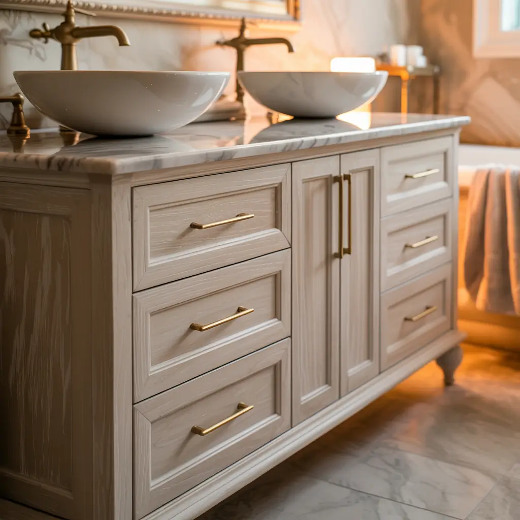 I upgraded my basic white oak vanity with brushed gold pulls and faucets, and suddenly it looked custom-designed. The gold brings out the honey tones in the oak while adding just enough glamour to feel special.
