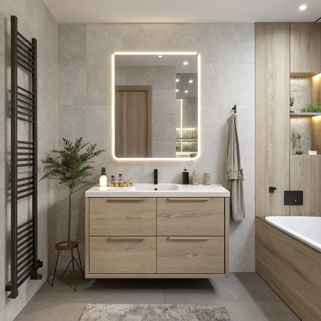 I paired mine with large format tiles and a frameless mirror that spans the entire wall. The white oak prevents the bathroom from feeling cold, while the modern elements keep it from looking like a log cabin.