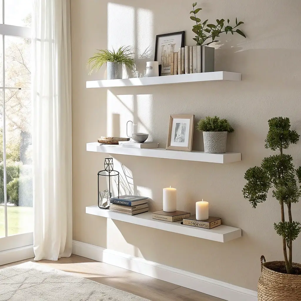 Floating white shelves bring that clean, gallery-like aesthetic that makes everything you display look more expensive. I installed three pure white floating shelves in my living room, and suddenly my random collection of books and plants looked like a curated exhibition.