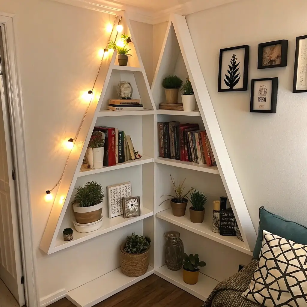 Corner shelves turn dead space into display opportunities. My tiny apartment’s awkward corners now house white shelving that makes the space feel twice as big while providing actual storage.