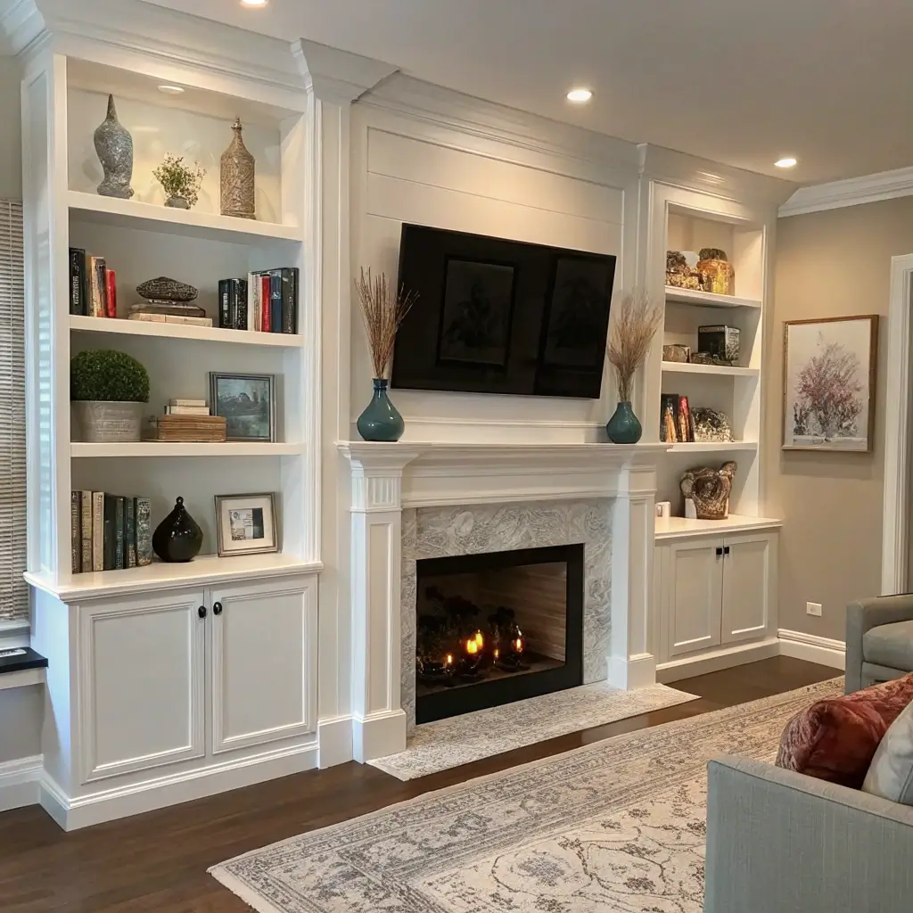 Built-in white shelves transform basic fireplaces into architectural features. My living room went from “basic builder grade” to “custom home” after adding floor-to-ceiling white shelving around the fireplace.