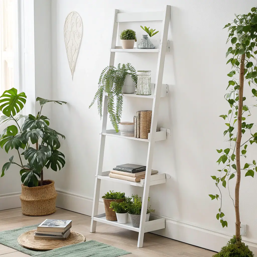 White ladder shelves provide the perfect backdrop for plants and natural elements. My home office features a white ladder shelf that displays my growing plant collection, creating this amazing contrast between crisp white and lush green.