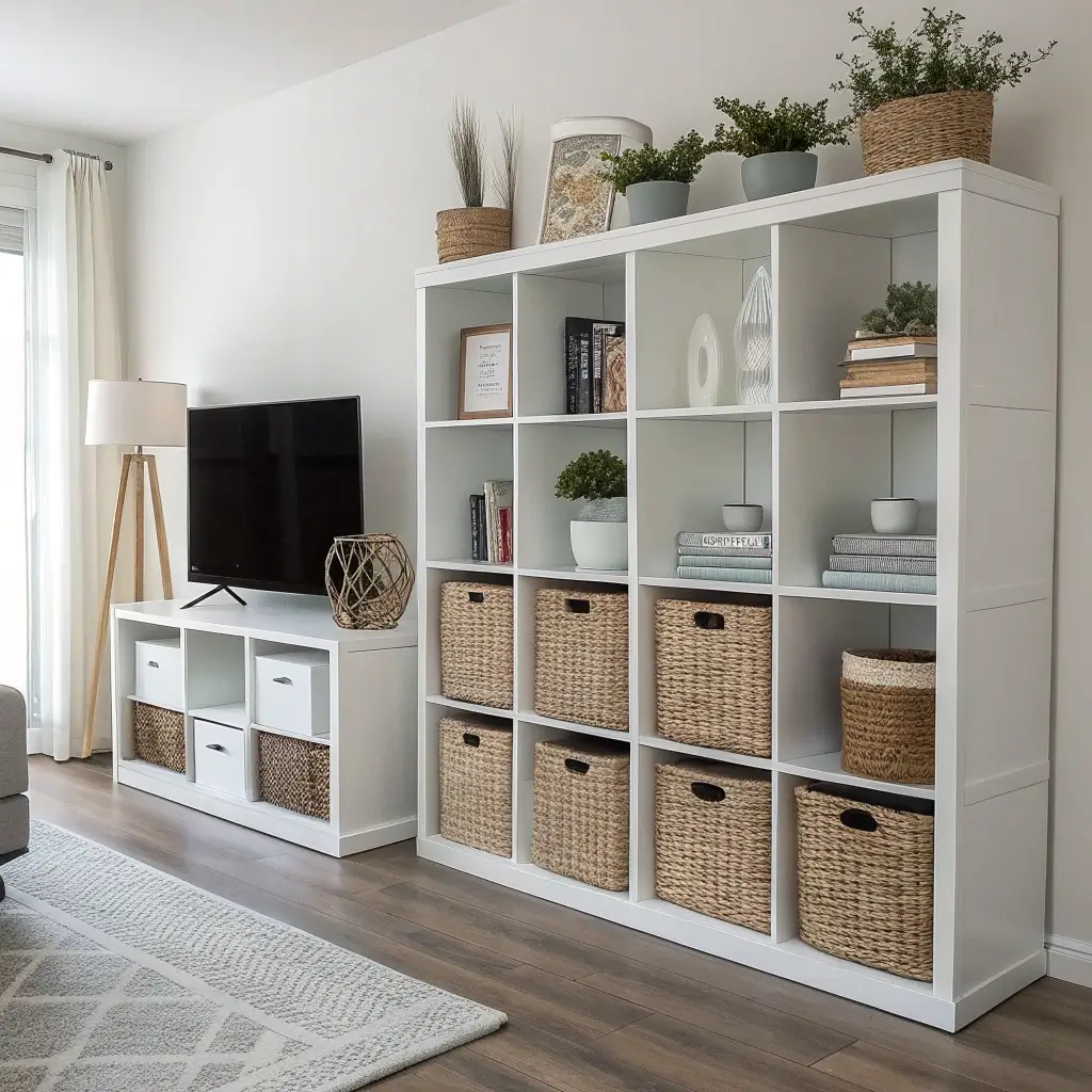 Mix open and closed storage. I use fabric bins in some cubes to hide clutter while leaving others open for display. The contrast keeps things interesting.