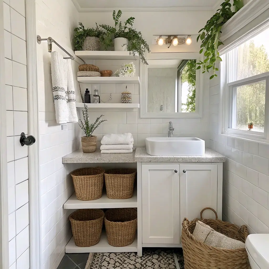 The combination of clean white shelves and warm baskets prevents the sterile look that can plague all-white bathrooms.