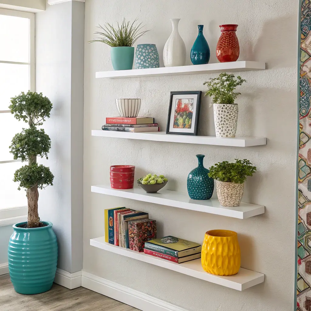 White shelves provide the perfect canvas for colorful displays. My living room shelves showcase bright art pieces and accessories that pop against the clean white background.