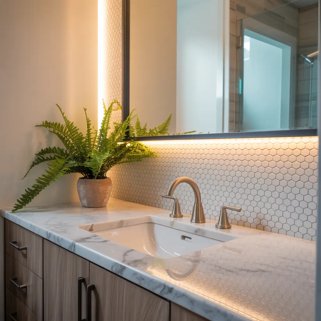 I created a custom vanity backsplash with white arabesque tiles, added LED strip lighting, and suddenly my morning face-washing feels like a spa treatment. It’s the little things, you know?