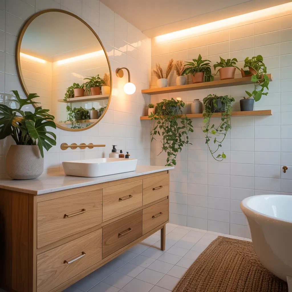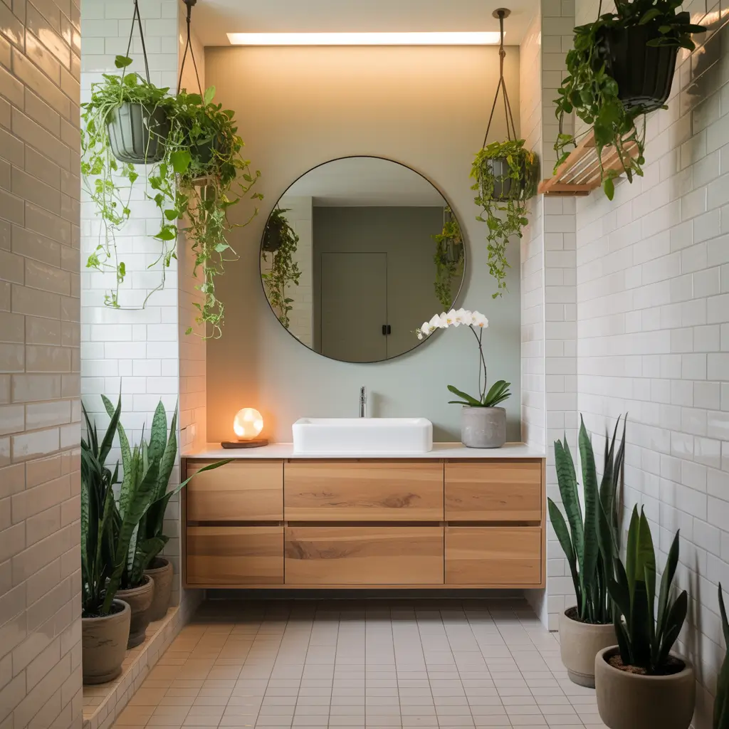 I’ve turned my bathroom into a mini jungle, and honestly, it’s my favorite room now. The contrast between crisp white tiles and lush green plants creates this fresh, organic vibe that no amount of decorating could achieve otherwise.