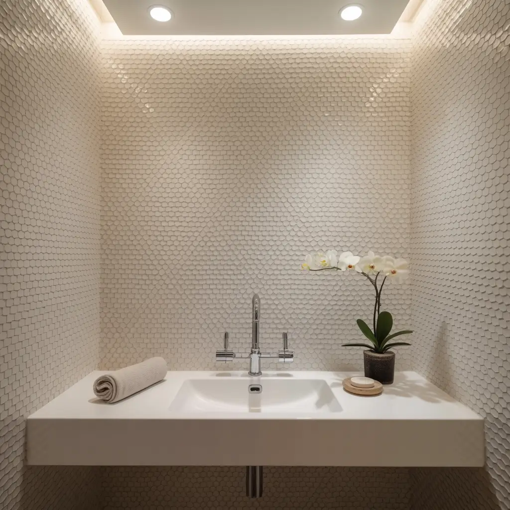 The key is balance – too many textures compete for attention. Pick one textured element and let it shine against your smooth white tiles.