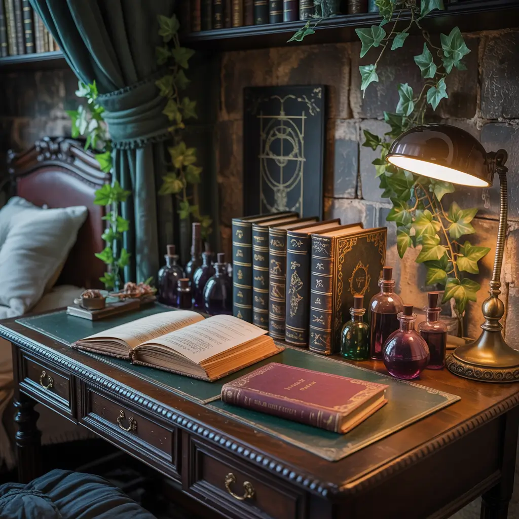 Layer deep browns, forest greens, and burgundy with aged gold accents. Think ancient library meets apothecary shop. The goal is creating a space that feels both learned and magical, where studying grimoires feels as natural as scrolling Instagram.