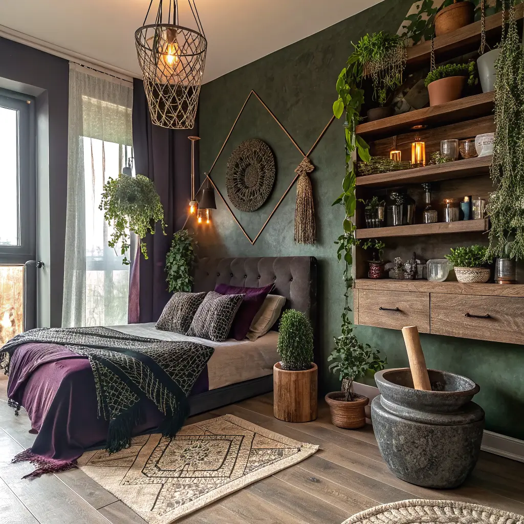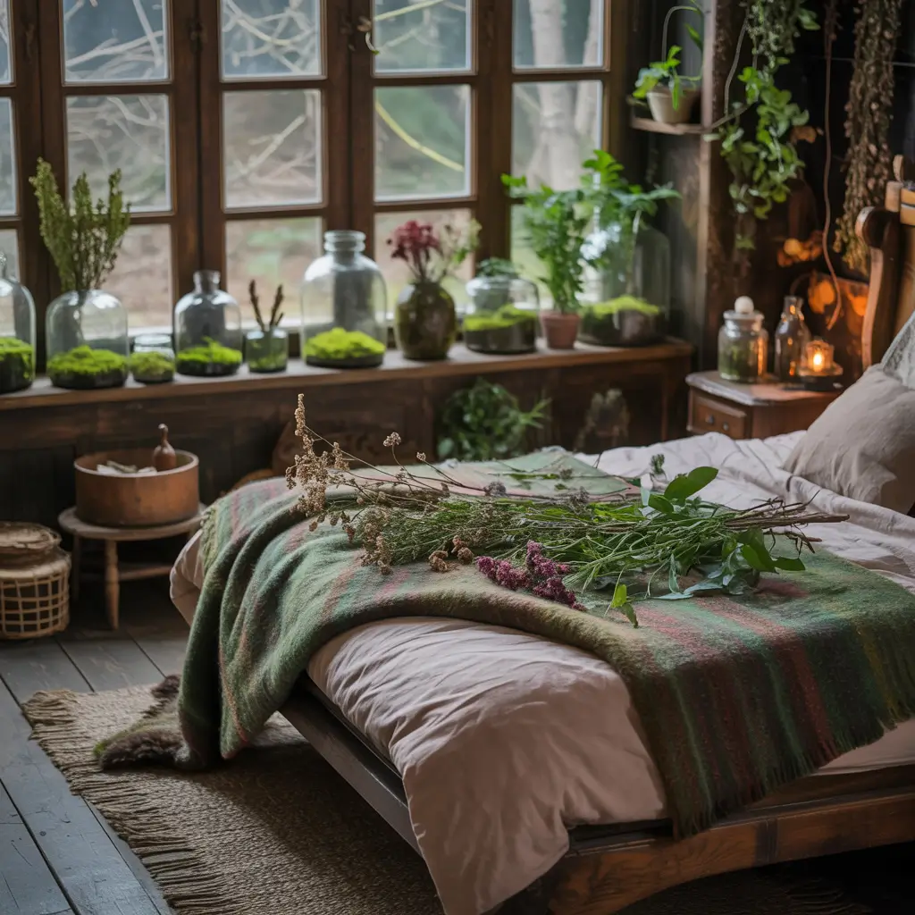 Create a living bedroom with plants as the main decor. Hang herbs to dry from the ceiling, grow magical plants on windowsills, and incorporate botanical elements everywhere. The goal is feeling like you sleep in a greenhouse sanctuary.