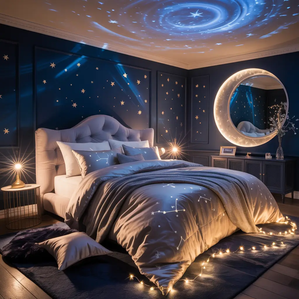 Focus on silver, white, and pale blue tones that mirror moonlight. The key lies in creating layers of light that mimic how moonbeams dance across surfaces. I hung sheer white curtains behind regular ones, and when backlit, they create this ethereal glow that makes me feel like I’m sleeping in moonlight.