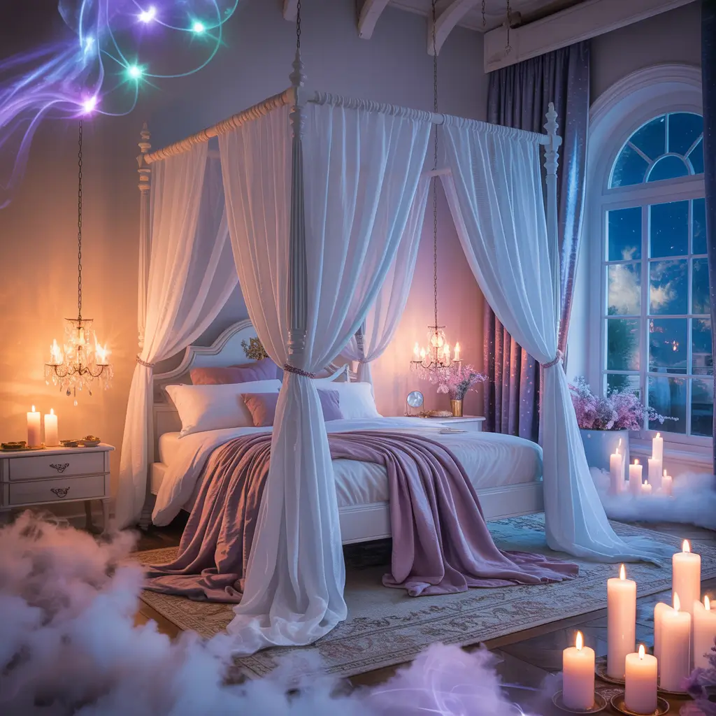 I achieved this look using layers of white sheer fabric and strategic lighting that creates an almost foggy, dreamlike quality. The room feels like stepping into a liminal space where magic feels more possible.