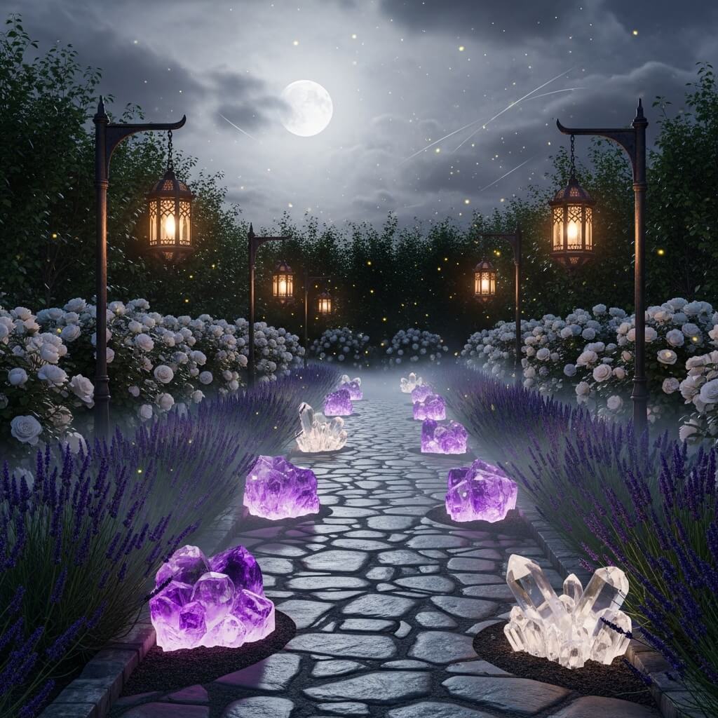 The key here is strategic crystal placement combined with reflective surfaces that catch and amplify moonlight. I’ve found that larger quartz pieces work beautifully as pathway markers, especially when you partially bury them so they look like they’re naturally emerging from the earth. The effect is pure magic – literally.