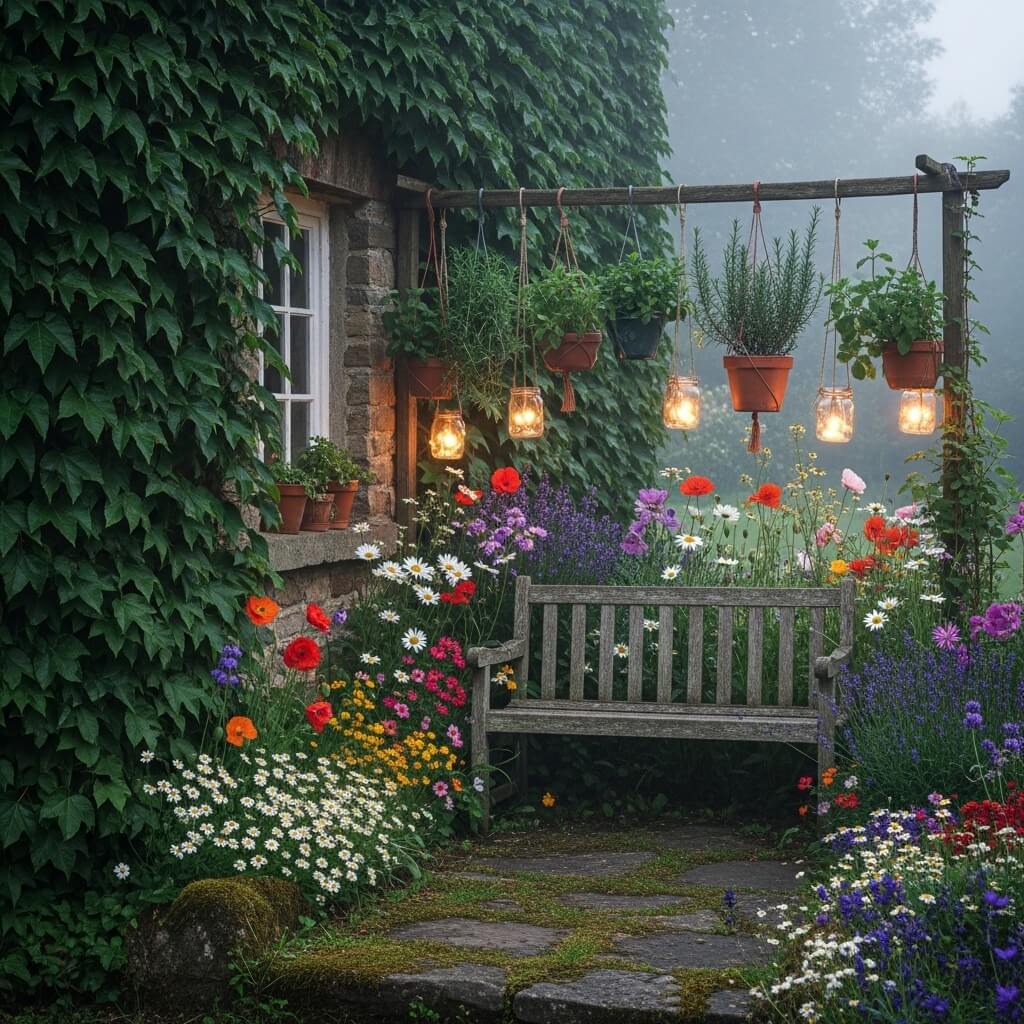 If your aesthetic leans more toward flowing fabrics, earthy textures, and that free-spirited witchy vibe, a boho witch garden with hanging lanterns creates the perfect relaxed magical atmosphere. This design is all about layered textures, warm lighting, and plants that move gracefully in the breeze.