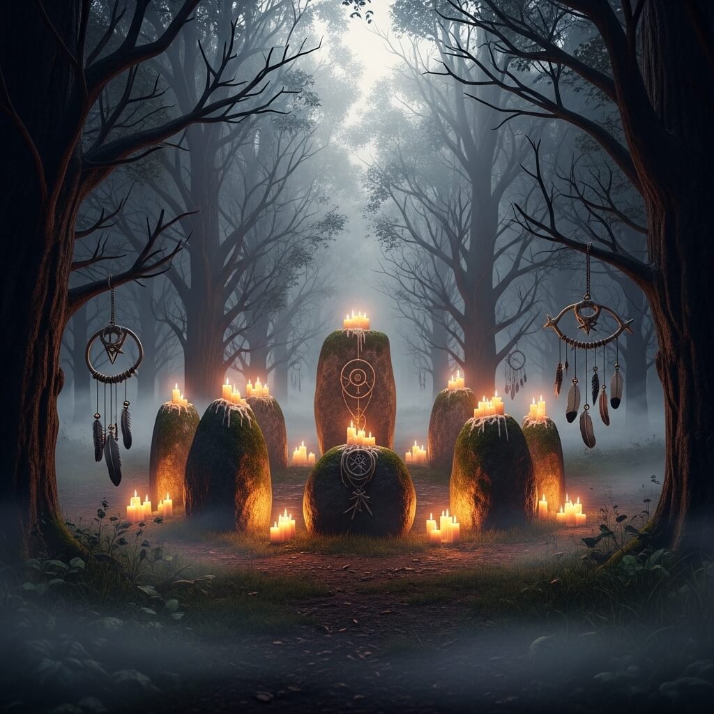 Consider the practical elements too: seating (even if it’s just a log or flat stone), storage for any tools or supplies you use, and perhaps a small altar area or focal point. A fire-safe area for candles or a small fire bowl can add to the ritual atmosphere.