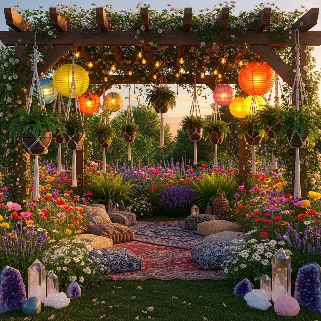 Seating areas are essential for the boho vibe – think floor cushions, low wooden benches, or hammocks. This garden should invite lingering and contemplation, not just quick walks through.