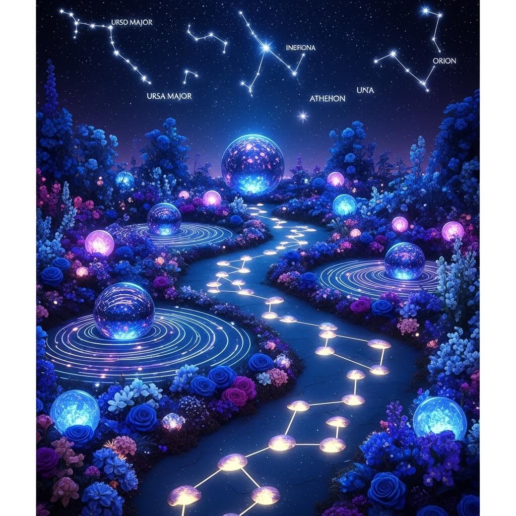 The pathways between star positions can be crushed white stone, glow-in-the-dark pebbles, or simply maintained grass. The key is creating clear sight lines so the constellation pattern remains visible even during daylight hours.