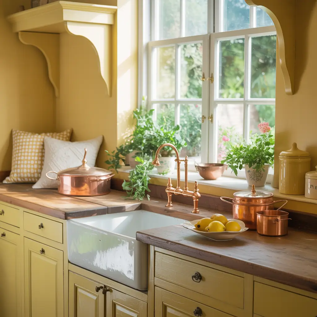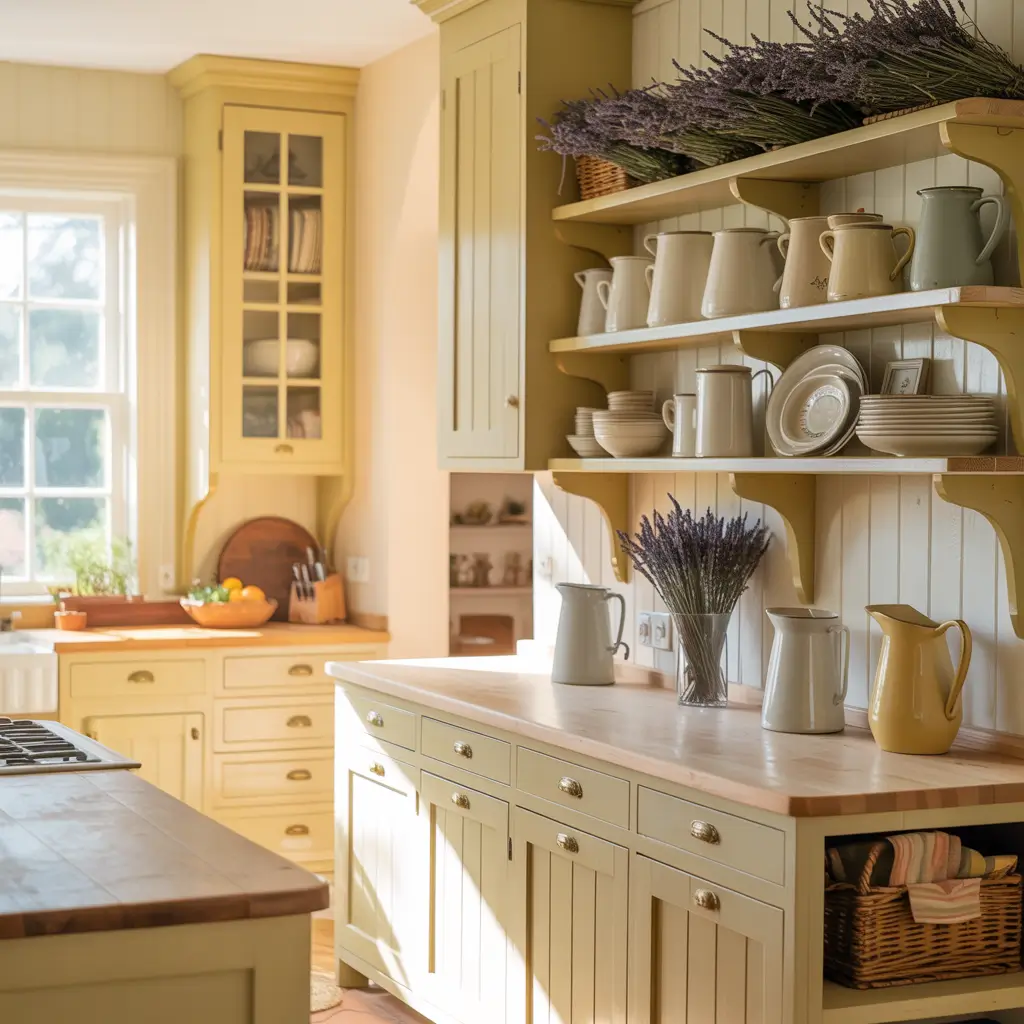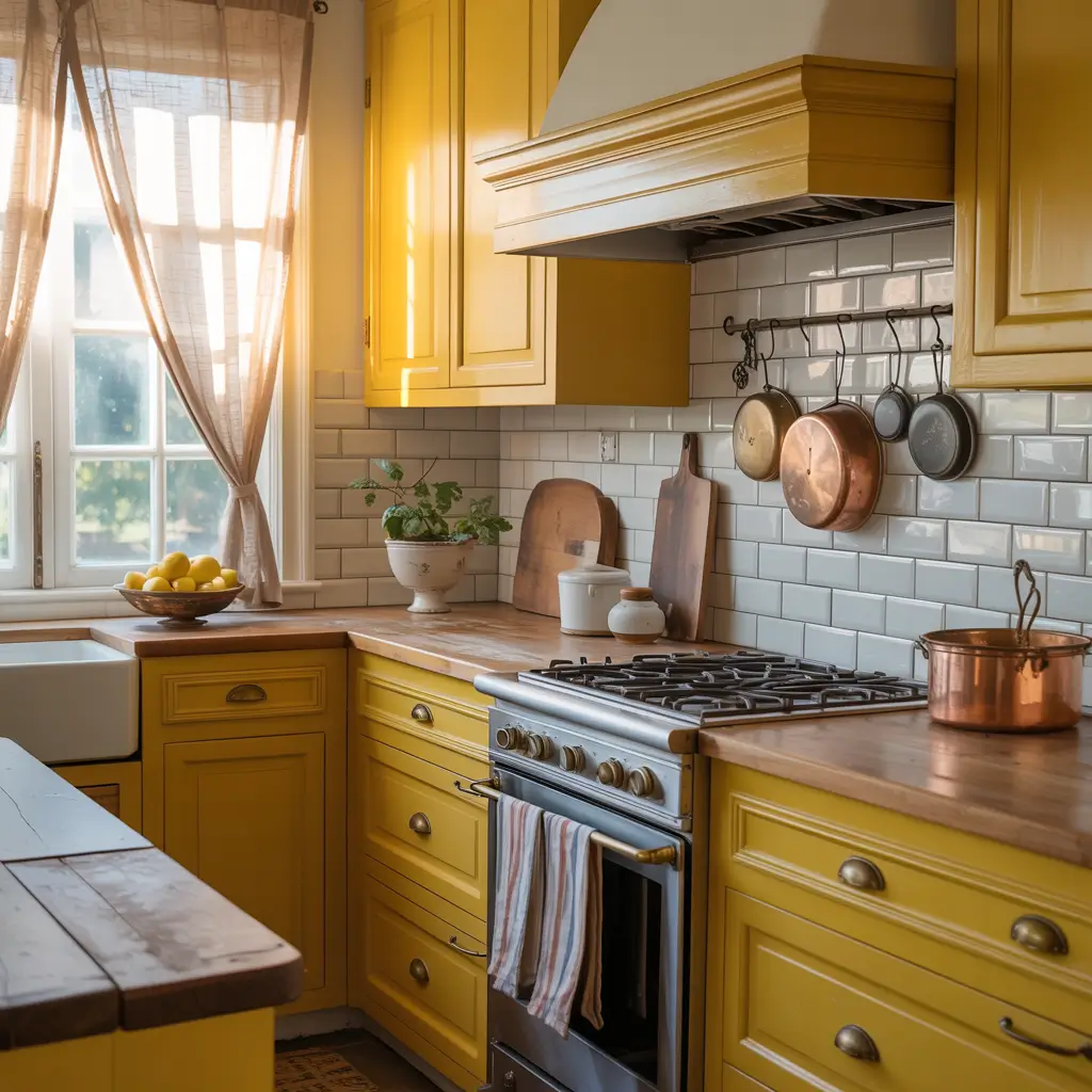 What really makes this work is the finish you choose. Skip the high-gloss and go for a satin or matte finish. It gives you that slightly worn, been-loved-for-generations look that farmhouse style demands. And honestly? Yellow cabinets hide fingerprints way better than white ones – just saying 🙂