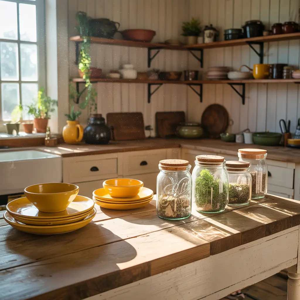 • Mixed yellow accessories among neutral dishes