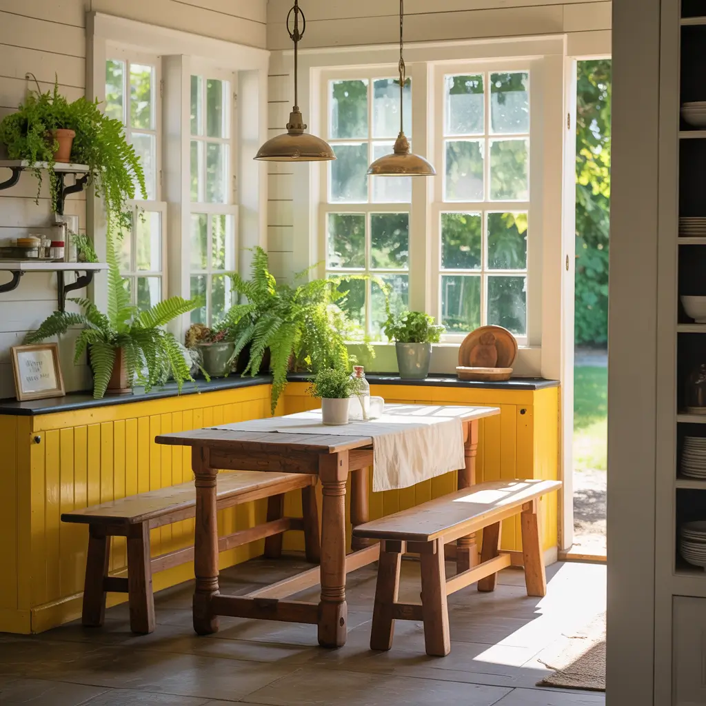 Remember those cozy diner booths from the 50s? A bright yellow breakfast nook captures that nostalgic charm while keeping things decidedly farmhouse.