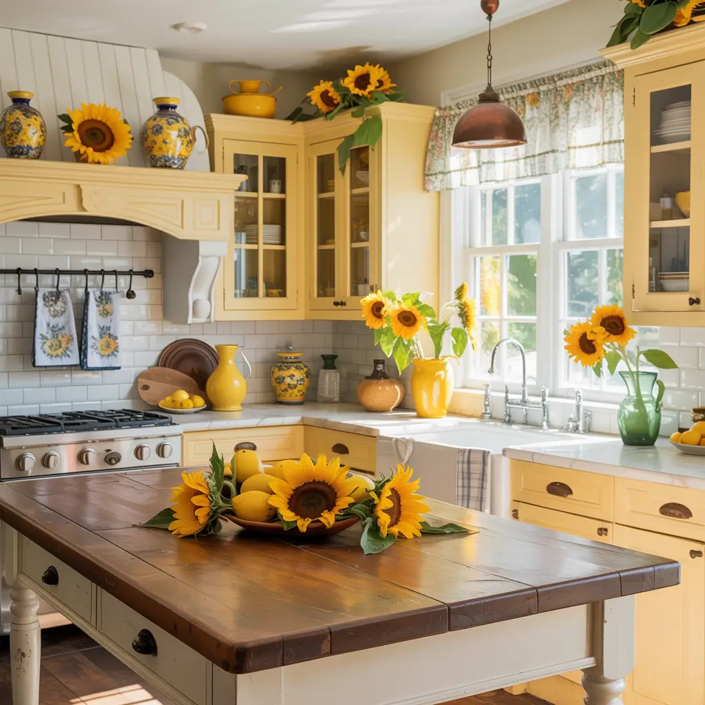 Why choose subtle when you can go full sunflower? A sunflower-themed kitchen brings maximum farmhouse cheerfulness without looking like a craft store explosion.