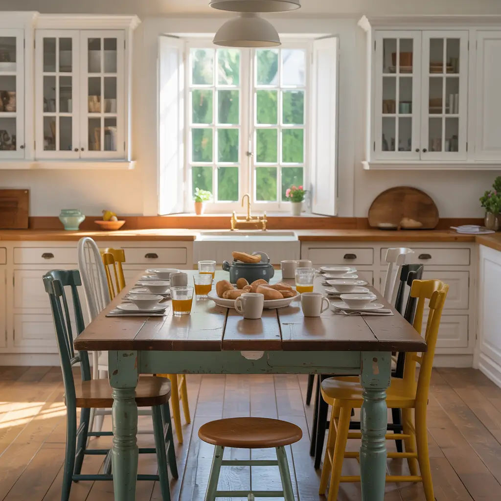 • Incorporate wooden furniture pieces like a farmhouse table