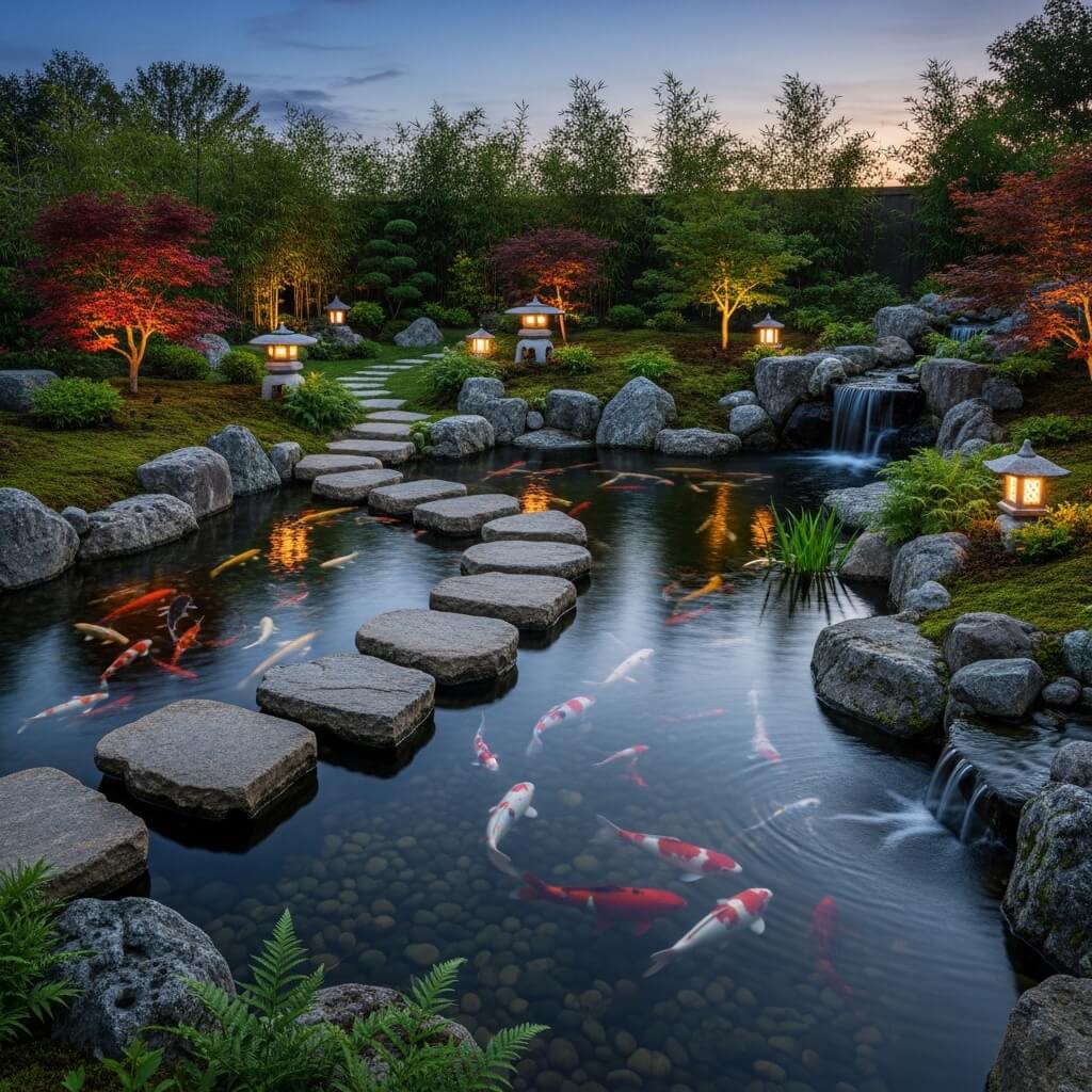 The pond shouldn’t exist in isolation—it’s the centerpiece of your entire garden design. Create gravel pathways leading to viewing areas, add a traditional bridge if space allows, incorporate stone lanterns and bamboo accents. Think of the pond as the heart with everything else radiating outward.