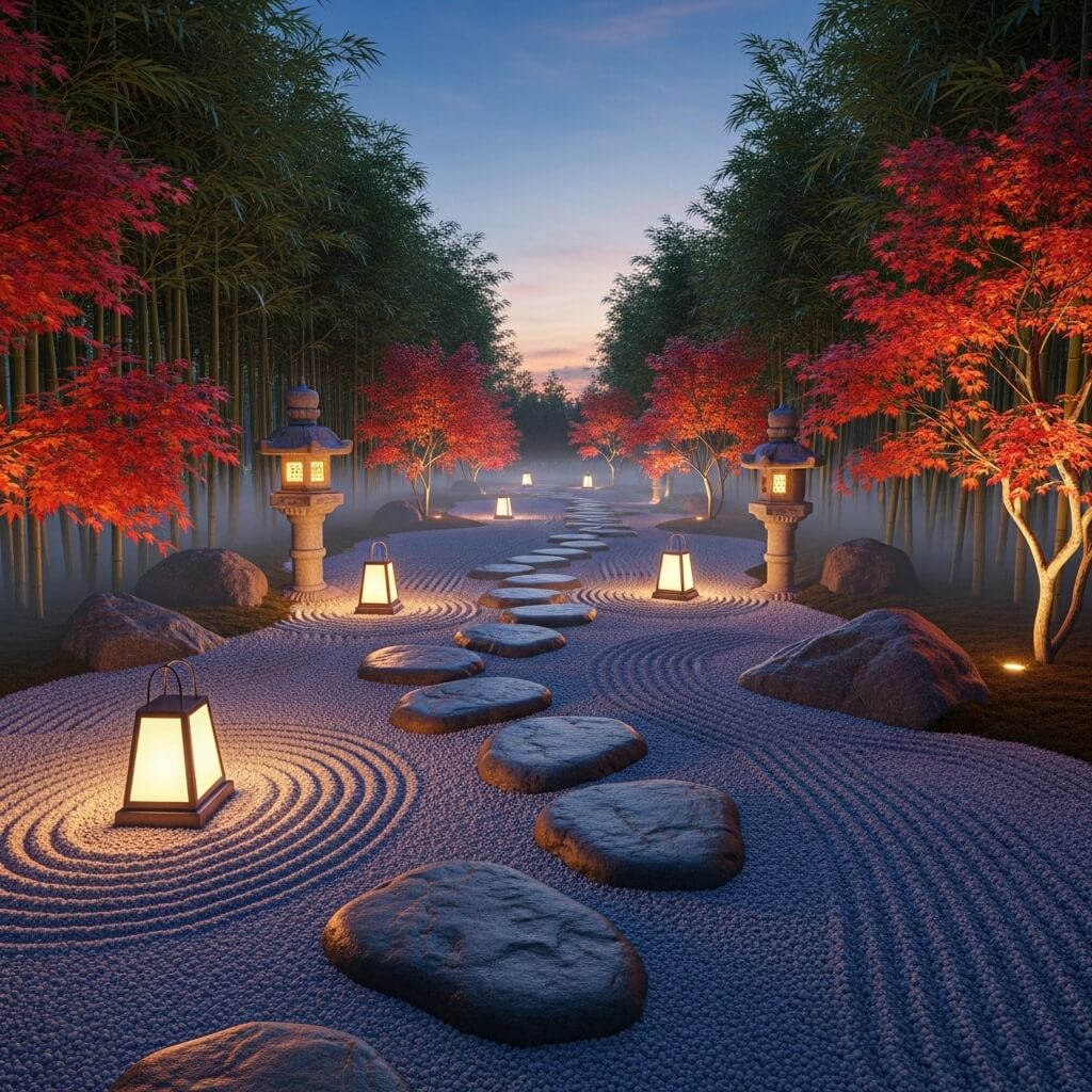Zen Garden Pathway with Lantern Lights