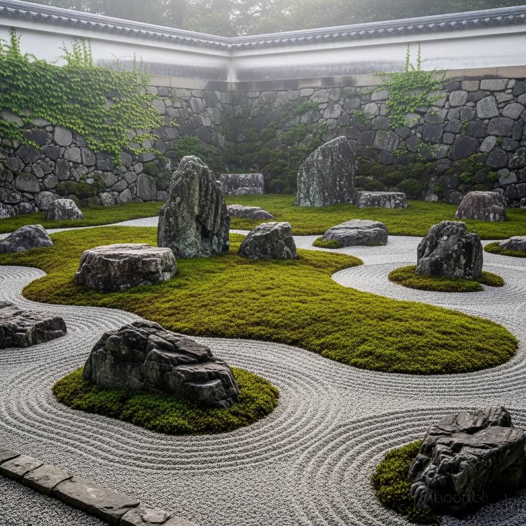 There’s something deeply satisfying about the combination of ancient-looking rocks and velvety moss. A courtyard rock and moss Zen garden feels like you’ve stumbled into a forgotten temple garden—mysterious, timeless, and profoundly peaceful.
